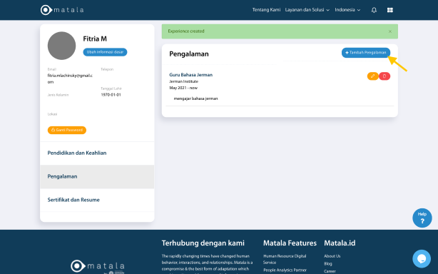 Klik +Add Experience untuk menambahkan berbagai pengalaman kerja