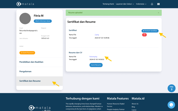 Klik +Add Certificate ketika memiliki sertifikat atas keahlian tertentu lalu jangan lupa untuk upload resume dengan format .pdf