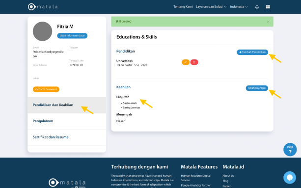 Selanjutnya lengkapi informasi diri pada kolom Education dan Skill
